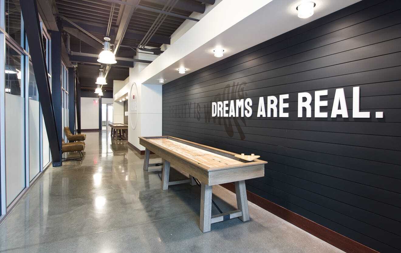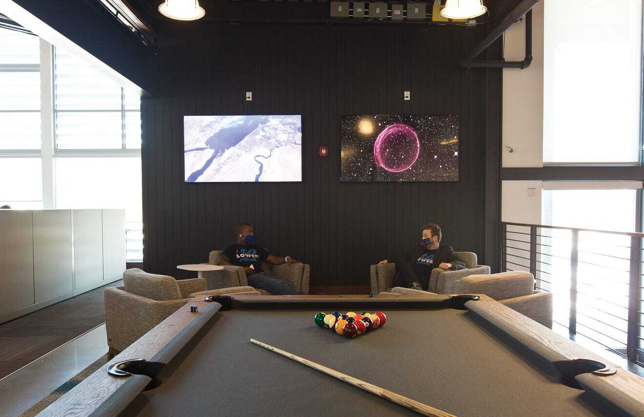 Upstairs a second lounge is situated with more TVs, pool tables and relaxed seating, and the shuffleboards are an added bonus. Desks and offices are decorated with cool tones and blue hues. The wall reads “Life at Lower,” a phrase designed for the company’s social media accounts that gives clients the chance to see beyond the business and into the lives of the team.